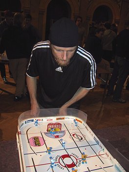 Lokakuisena lauantaina kokoontui Linnanmaalle taas mukavankokoinen joukko pöytäjääkiekkoilijoita mittelemään kauden kolmannen paikallisturnauksen paremmuudesta. Tällä kertaa oli luvassa mielenkiintoa tavallistakin enemmän, kun Kuopion suunnalta saapuivat pelaamaan myös Markus Laakso ja Ahti Lampi. Kärppäfani Laakso löi jälleen kaksi kärppää yhdellä iskulla: ensin Oulun liigan pöytälätkäturnaus ja sen jälkeen ohjelmassa oli Kärppämatsi Raksilassa.
